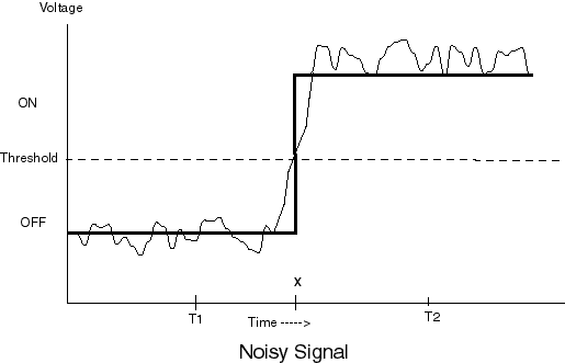 QUESTION 8:Something might be wrong here. What if you need to know if the signal is "on" or "off" at the time "x" in the picture. A slight bit of noise will make this ambiguous. How can this be handled? (Hint: do you need to know the value of the signal at all times?) Click Here after you have answered the question |