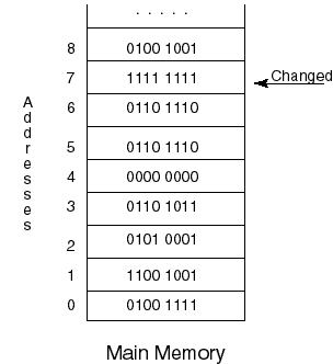 The processor has written a byte of data at location 7. The old contents of that location are lost. Main memory now looks like the picture. When a program is running, it has a section of memory for the data it is using. Locations in that section can be changed as many times as the program needs. For example, if a program is adding up a list of numbers, the sum will be kept in main memory (probably using several bytes.) As new numbers are added to the sum, it will change and main memory will have to be changed, too. Other sections of main memory might not change at all while a program is running. For example, the instructions that make up a program do not (usually) change as a program is running. The instructions of a running program are located in main memory, so those locations will not change. When you write a program in Java (or most other languages) you do not need to keep track of memory locations and their contents. Part of the purpose of a programming language is to do these things automatically. |