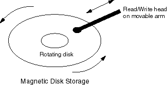 The hard disk of a computer system records bytes on a magnetic surface much like the surface of audio tape. The recording (writing) and reading of the data is done with a read/write head similar to that used with audio tape. The picture shows one disk and one read/write head at the end of a movable arm. The arm moves in and out along a radius of the disk. Since the disk is rotating it will record data in a circular track on the disk. Later on, to read the data, it must be moved to the right position, then it must wait until the rotating disk brings the data into position. Just as with audio tape, data can be read without changing it. When new data it recorded, it replaces any data that was previously recorded at that location. Unlike audio tape, the read/write head does not actually touch the disk but skims just a little bit above it. Usually the component called the "hard disk" of a computer system contains many individual disks and read/write heads like the above. The disks are coated with magnetic material on both sides (so each disk gets two read/write heads) and the disks are all attached to one spindel. All the disks and heads are sealed into a dust-free metal can. Since the operation of a hard disk involves mechanical motion (which is much slower than electronic processes), reading and writing data is much slower than with main memory. |