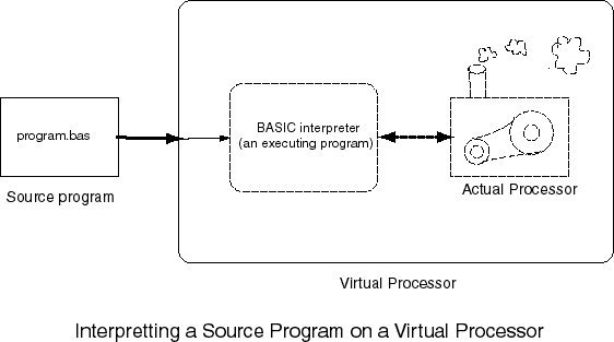 Virtual MachineWhen an interpreter is running a BASIC source program, both the interpreter and the source program are in main memory. The interpreter consists of machine instructions that the hardware can execute directly. The BASIC source program consists of commands in the language BASIC that the interpreter knows. From the perspective of the BASIC program, it looks like the commands in BASIC are being directly executed by some sort of machine. Here is the figure, modified to show this: