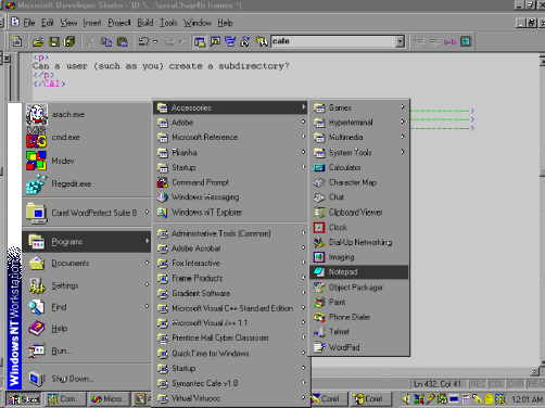Starting NotepadThe text editor we will use is called "Notepad." It comes with Microsoft operating systems. Click on the "Start" button in the lower left, then on "Programs" then on "Accessories", and then on "Notepad":