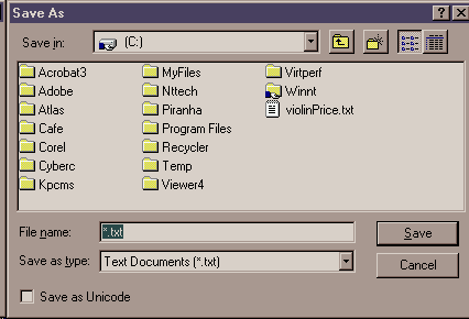 Saving the Source FileMove the mouse pointer to "File" and click on it. You will get a sub-menu. Now click on "Save As". As the picture shows, you may not start out n the C:\Temp directory. If not, you will have to use the various controls at the top of the "Save As" dialog to get to the directory you want.