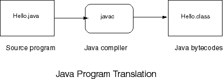 BytecodesJava combines these ideas in a way that will take some explaining. To get the sample program running, it first is translated into bytecodes. A Java bytecode is a machine instruction for a Java processor chip. The architecture of this processor has been very carefully described by the designers of Java and is freely available to anyone. It will turn out that you do not actually need the Java processor chip in your computer to run Java. To run a Java program on the Java processor chip, the souce program (the text file) must be translated into bytecodes. Here is a picture of the sample Java program Hello.java being translated into bytecodes. The file of bytecodes (machine language for the Java chip) is called Hello.class.