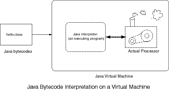 Java Virtual MachineNow for the clever part: a Java bytecode interpreter executes the bytecode file. The Java bytecode interpreter is an executable program for whatever processor you computer system has. Here is a picture showing this:
