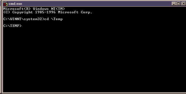 The system prompt is (at the moment) This prompt means that any files you create will (unless you ask otherwise) go onto the hard disk in the subdirectory C:\WINNT\System32. (A subdirectory is a section of the disk that has a name. A subdirectory can hold many files.) You should not create files in this subdirectory. You will probably get a prompt that starts out in some other subdirectory. It doesn't matter where you start out because you can always move to where you want to be using the CD command (upper or lower case both work.) For now, let us create a Java program in the C:\Temp directory. To get to this directory type the command:C:\WINNT\System32> Typed the command in after the DOS prompt. The prompt changes to show the current default directory.CD \Temp |
