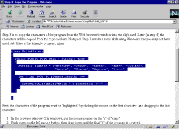 Step 3: Copy the ProgramStep 3 is to copy the characters of the program from the Web browser's window into the clipboard. Later (in step 4) the characters will be copied from the clipboard into Notepad. Step 3 involves some skills using Windows that you may not have used, yet. Here is the example program, again: