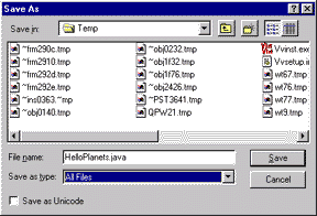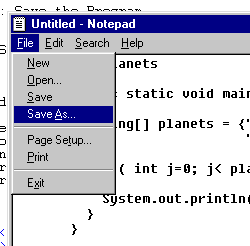 Type in the name of the source file: "HelloPlanets.java"in the "File Name" text box. In some versions of Notepad you must use quote marks around the name of the file. Now Select "All Files" in the "Save as Type" text box. Finally, click on the "Save" button. |