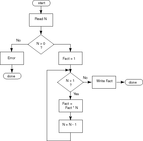 Another way to do this is to use N as the counter, and count it down until it reaches 2, so its values will be: 5, 4, 3, and 2. These values will be multiplied together one by one. There is no need to multiply by 1, so the loop's condition is N > 1. Here is a flowchart of the program. It tests if N is a correct value before it calculates N! This is somewhat trickier logic than previous programs have used. Study the flowchart until you see how it works. Don't worry about the details of Java (yet!) In fact, the flowchart says nothing about which language the program will be written in. The same flowchart could be used for Ada, C, C++, BASIC, FORTRAN, Pascal... and others. |