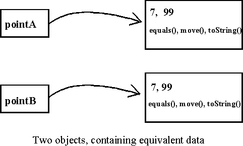 Different Objects, Equivalent DataHere is a picture showing the situation. Although there are two objects (each constructed out of different bytes of memory), the equals() method returns true because the data is equivalent.
