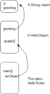How many objects exist just before this program stops running? A good answer might be:Two: the String object that contains "A Greeting!" and the HelloObject. |