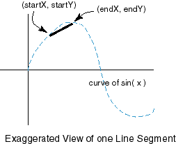 The idea is that each iteration of the loop will compute two points on the curve sin(x) and connect them with a line. If the separation between all the points is small, all the straight lines will look like a curve. The various floating point values (such as x) are cast into int because that type is what drawLine() expects.