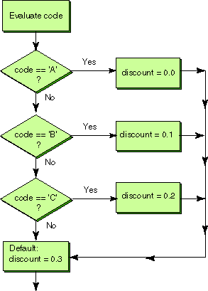 Flowchart of a break StatementHere is the example program fragment (again) and a flowchart that shows how it works. The box in the flowchart "evaluate code" means to get the current value of code. In a larger program this would usually be different every time.