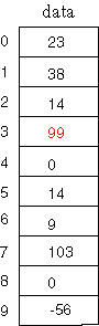 Every slot of an array holds a value of the same type. So, for example, you can have an array of int, an array of double, and array of String, and so on. The picture on the left shows an array of int. Every slot contains an int. A slot of this array can be used anywhere a variable of type int can be used. For example, works just like an assignment statement with an int variable on the left of the assignment operator. After it has been executed, the array will look like the picture on the right.data[3] = 99 ; The value in slot 3 of the array has been changed. |