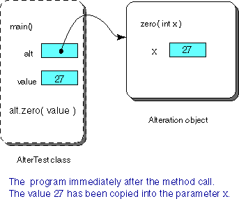 Java uses call by value for parameter passing, which means that the content (the value) of a variable is sent to a method when the variable is used as a parameter. The picture shows the review program immediately after the method call. The value 27 from main()'s variable value has been copied into the parameter x. |