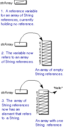 You can declare an array of String references: String[] strArray; // 1. This declares a variable strArray which in the future may refer to an array object. Each slot of the array may be a reference to a String object (but so far there is no array.) To create an array of 8 String references do this: strArray = new String[8] ; // 2. Now strArray refers to an array object. The array object has 8 slots (elements.) However none of the slots refer to an object (yet.) The slots of an array of object references are automatically initialized to null, the special value that means "no object." Now, to actually create a String and store its reference in slot zero of the array, do this: strArray[0] = "Hello" ; // 3. Remember that with String objects you don't have to explicitly use new (it happens automatically.) |