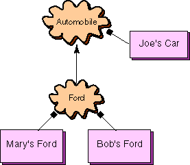 The picture at left shows a parent class and a child class, and some objects that have been constructed from each. These objects are shown as rectangles (to convey the idea that they are more real than the classes, which are only designs.) In the picture, "Joe's car," "Mary's Ford," and "Bob's Ford" represent actual objects. The cloudy classes represent designs that were used to construct the objects. | |