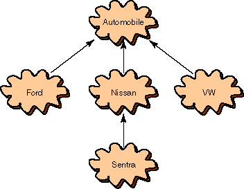 This picture shows a hierarchy of classes. It shows that "Ford is-a automobile," "Nissan is-a automobile," and that "VW is-a automobile." It also shows that "Sentra is-a Nissan." In a hierarchy, each class has at most one parent, but might have several child classes. There is one class, at the "top" of the hierarchy that has no parent. This is sometimes called the root of the hierarchy. | |