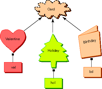 By using hierarchical organization and inheritance it is easy to add many more card classes and to create a well organized program. This was unthinkable not too many years ago. Here is a sample run of this program: Your name: Sue Dear Sue, Season's Greetings! Dear Sue, Happy 21th Birthday Dear Sue, Love and Kisses, XXXXXXX When the main() method has constructed its three objects, the situation is as in the picture. There are three classes that can be instantiated, and one object of each class has been instantiated. Of course, as many objects as you need of each type (except Card) can be instantiated.