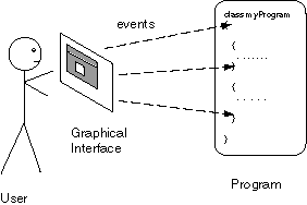 In Java programming, you can get the GUI components you want merely by asking for them. Most of the work has already been done and is contained in the Abstract Windowing Toolkit (AWT), a package that contains classes for graphics and GUI programming. To use the AWT in a program you will need to import it: import java.awt.*; Now you can use the AWT to create windows, frames, buttons, menus and other components. A user interacting with a GUI application generates events, which the application must handle, in what ever order they arrive. The picture shows this. Each time the user does something, an event is sent to the application. Different events are sent to different parts of the application. The application has to work correctly no matter what the user does. A GUI program consists of three types of software: