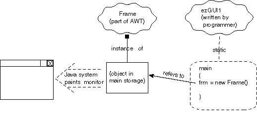 Picture of the FrameAlthough the class ezGUI1 has been defined it is not instantiated. The main() method is a static part of that class, not part of any object. Review the beginning chapter on objects (currently chapter 25) if this is unclear. Here is a picture of what is going on: