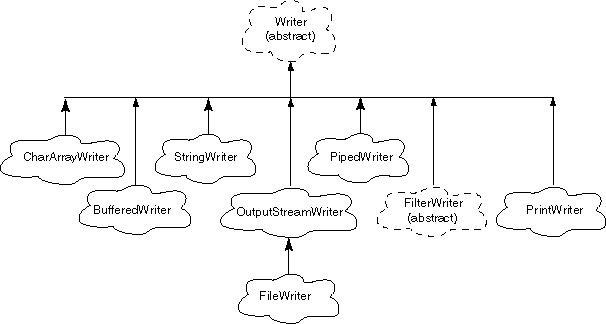 The arrows in this diagram show inheritance (not data flow). A FileWriter is a kind of OutputStreamWriter, which is a kind of Writer, which is a kind of Object. When you read Java documentation, you might look at several ancestors as you study a promising class you are. |