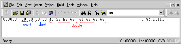 Same as BeforeA dump of the new file is indistinguishable from that of the previous file. A program that reads data from this file must be written with the knowledge of how the file was written. (Of course, since I know how it was written the brackets under the bytes show the intended groupings).