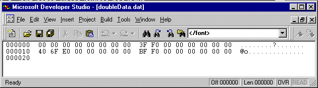 The hex dump of "doubleData.dat" shows four groups of eight bytes.